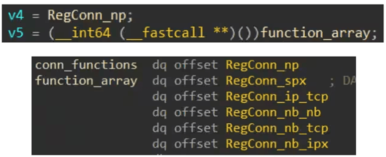 Нам просто нужно понять, почему имеются два конфликтующих вызова. При изучении логики функции мы обнаружили, что в ней используется переменная-указатель на функцию и массив функций. Эти функции задают информацию привязки RPC для использования конкретного транспорта RPC; по умолчанию используется SMB и именованные каналы, но, если это не удаётся, происходит попытка привязки через SPX, TCP/IP и другие.