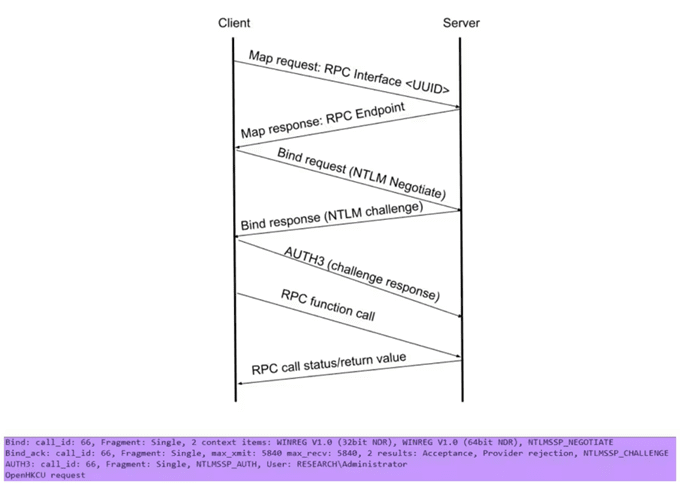 Ключевой момент связан с NTLM. В процессе привязки RPC с NTLM сначала отправляется сообщение о начале NTLM-переговоров, затем сервер возвращает NTLM-вызов в ответ на запрос привязки. Наконец, клиент отправляет ещё одно сообщение, называемое AUTH3, с ответом на вызов.