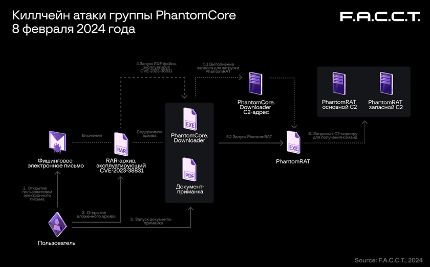 Атаки PhantomCore начинаются с рассылки фишинговых писем, содержащих защищенные паролем RAR-архивы. Пароль к архивам указан прямо в тексте письма. В архивах злоумышленники эксплуатируют новую вариацию уязвимости WinRAR (CVE-2023-38831), где вместо ZIP используются RAR-архивы.