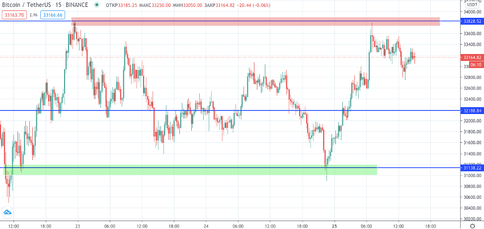 На небольшом таймфрейме просматривается ценовой канал с границами $31 130 и $33 830 — некоторое время биткоин может еще оставаться в этих пределах и демонстрировать ложные пробои в обоих направлениях.