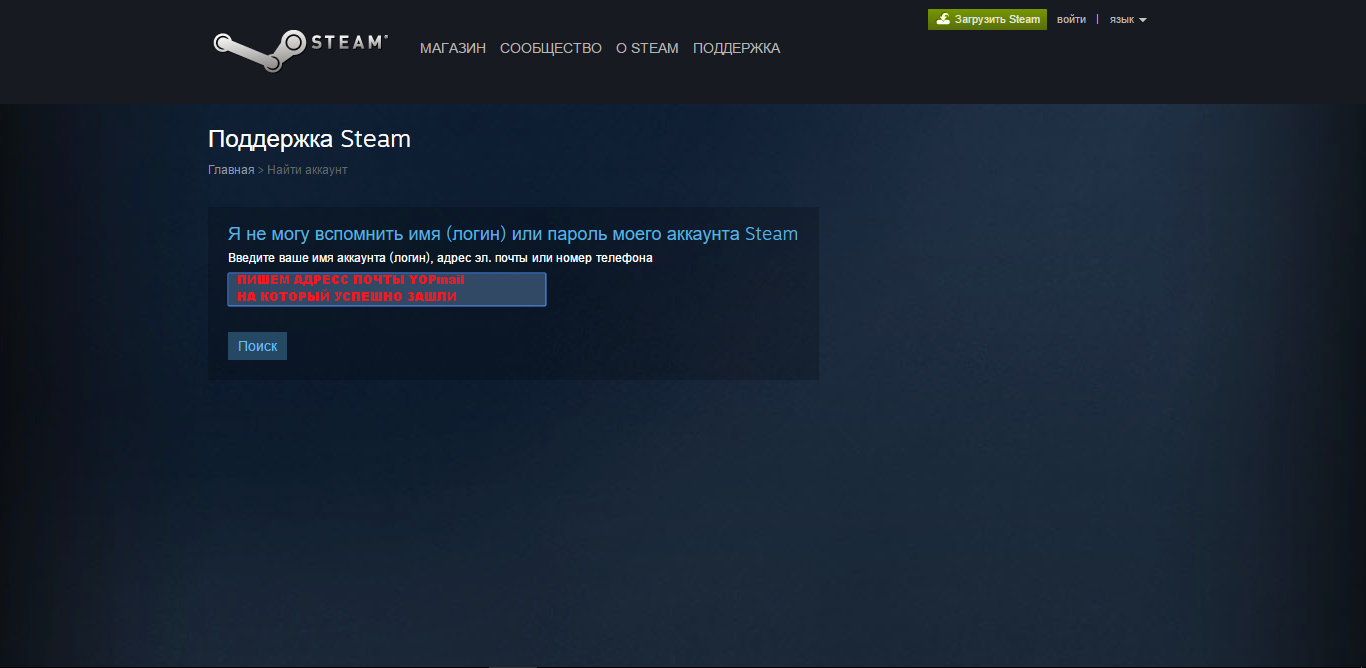 Берем адресс нашей почты и идем на сайт STEAM востанавливать аккаунт сайт STEAM -->