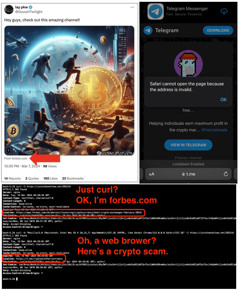 Ситуация вызвала обеспокоенность после того, как было обнаружено, что рекламное объявление, обещающее перевести на сайт forbes[.]com, на самом деле перенаправляет пользователей на аккаунт в Telegram, связанный с сомнительными криптовалютными схемами.