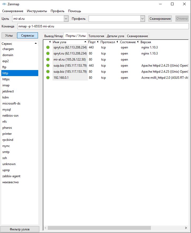 Результаты, полученные при последнем сканировании видны во вкладке Вывод Nmap. В левой части вы можете переключаться между Узлами и Сервисами. При клике на определённый узел, вы увидите предыдущие результаты сканирования. При клике на сервис, вы увидите узлы, на которых данных сервис был обнаружен: