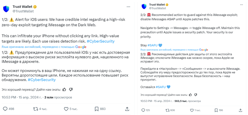 Компания Trust Wallet призвала пользователей Apple отключить iMessage из-за информации о критической уязвимости нулевого дня, которая позволяет хакерам захватить контроль над смартфонами.