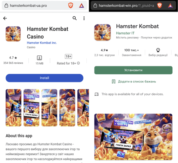 Кроме того, были выявлены фальшивые веб-сайты, имитирующие интерфейсы магазинов приложений, которые вместо установки игры показывают нежелательную рекламу.