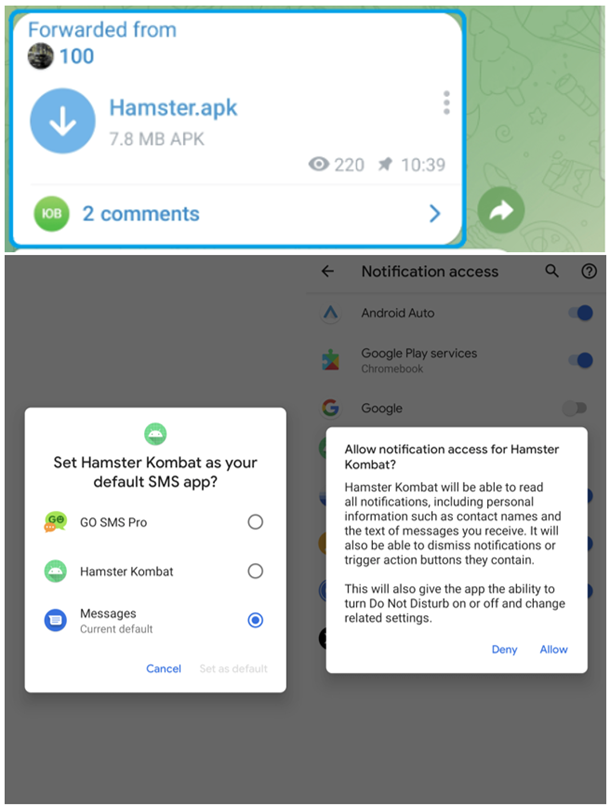Среди угроз для Android был обнаружен шпионский софт Ratel, замаскированный под Hamster Kombat и распространяемый через Telegram-канал. Вредоносная программа способна перехватывать уведомления и отправлять SMS-сообщения, используя средства жертвы для оплаты подписок и услуг. Хотя вредоносное приложение использует название Hamster Kombat для привлечения потенциальных жертв, оно не содержит никаких функций, которые можно найти в игре, и даже не имеет пользовательского интерфейса